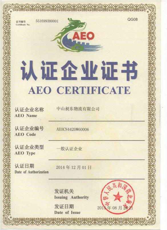 Certified enterprise certificate of AEO Certificate (East Changer logistics)