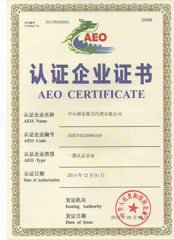 Certified enterprise certificate of AEO Certificate (East Changer customs broker)